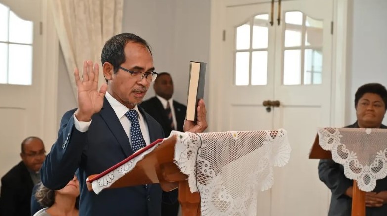 Joaquim da Fonseca menandatangani akta Sumpah Setia dan Sumpah untuk Pelaksanaan Tugas yang Sah sebagai Ketua Komisi Kebenaran dan Rekonsiliasi Fiji pada 29 Januari 2026. Foto FijiNews